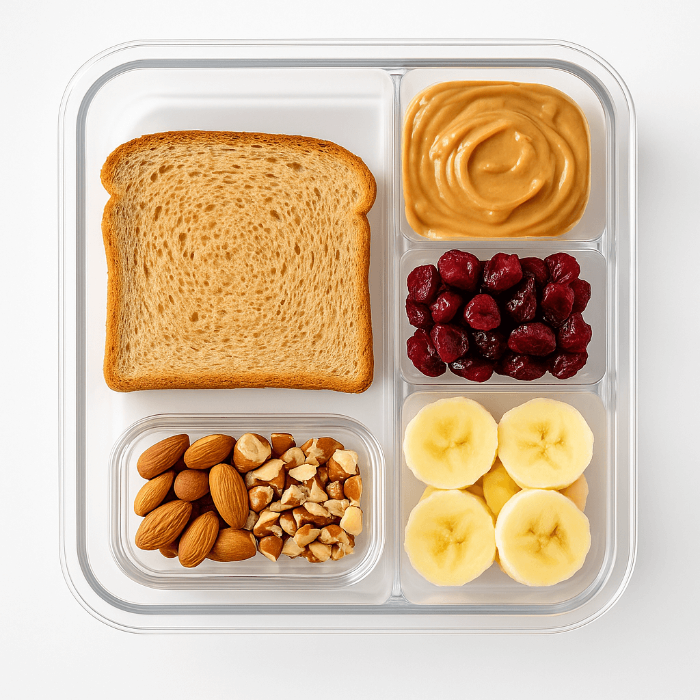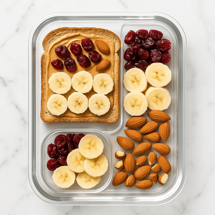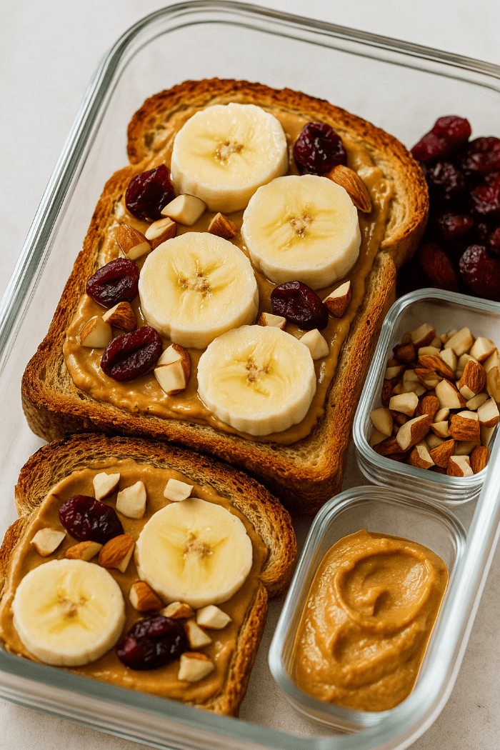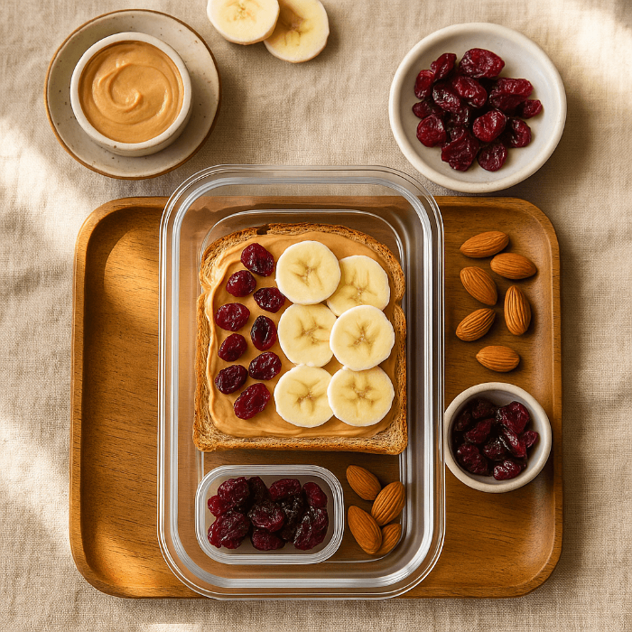 통밀식빵이나 오트 토스트 위에 땅콩버터를 바르고, 건크랜베리와 바나나를 올려주면